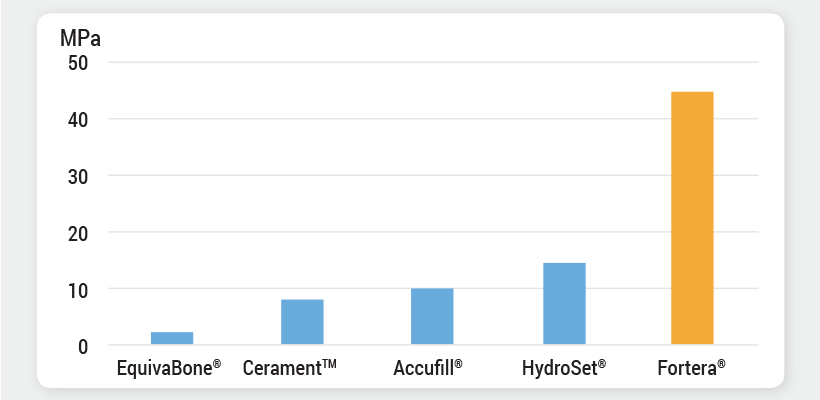 † Fortera is a trademark of Vivorté, Inc. All other trademarks are the property of their respective owners. Compressive strength reference values obtained from the following sources: Colon et al. The Knee (2015); Wang et al. Journal of Orthopaedic Translation (2016); EquivaBone Bone Graft Substitute Product Brochure, Zimmer Spine (2015), Vivorté data on file.